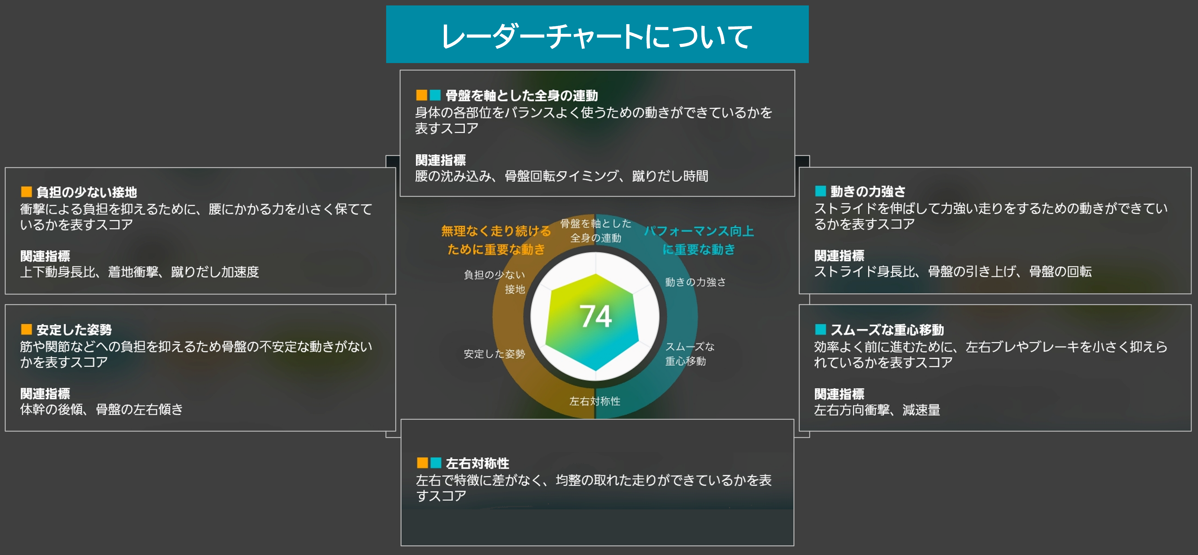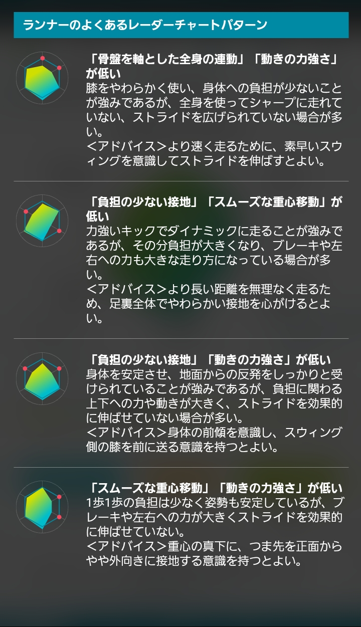 走りの振り返りには、まずレーダーチャートでフォームの状態や改善ポイントを確認しましょう!